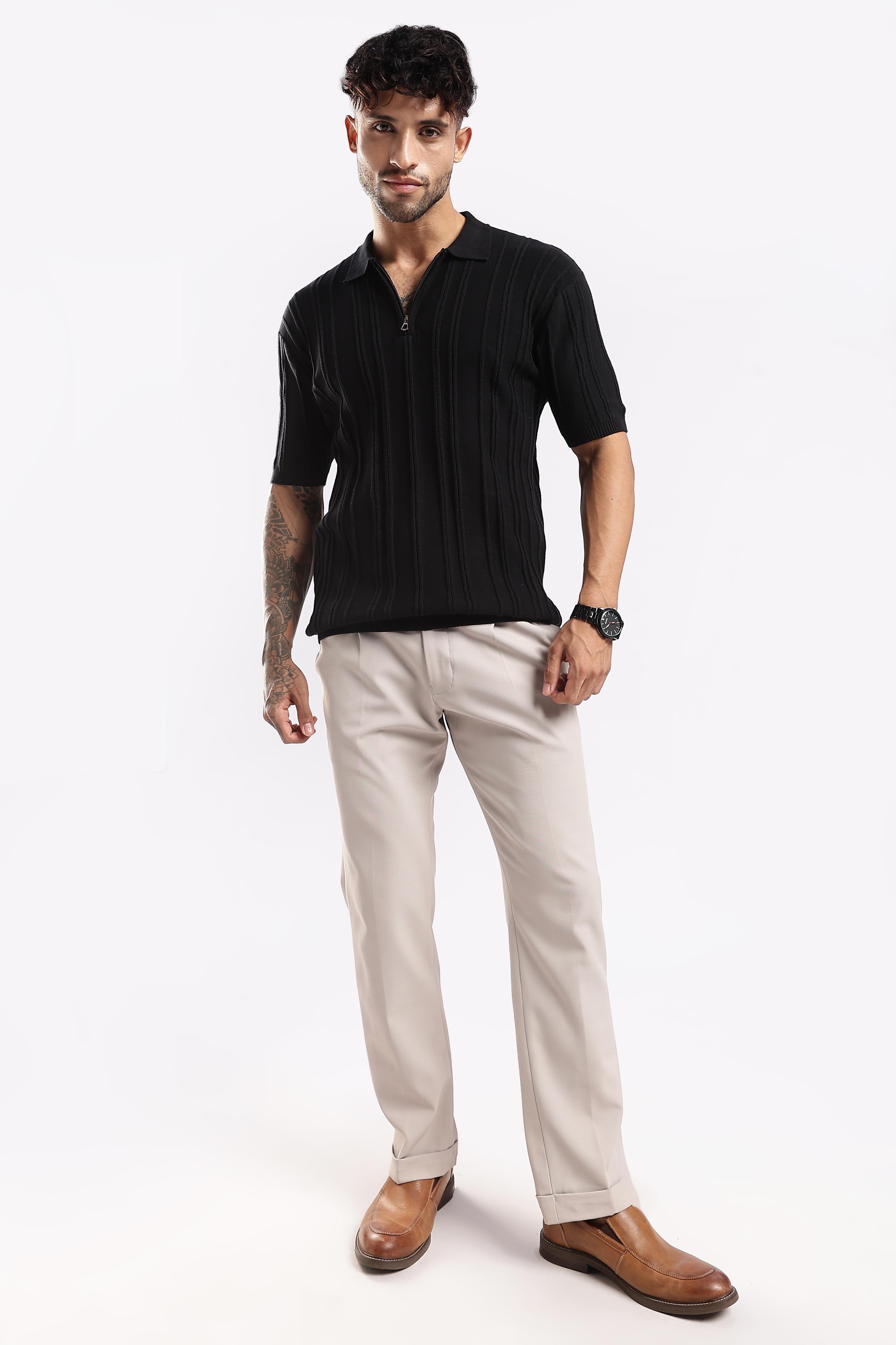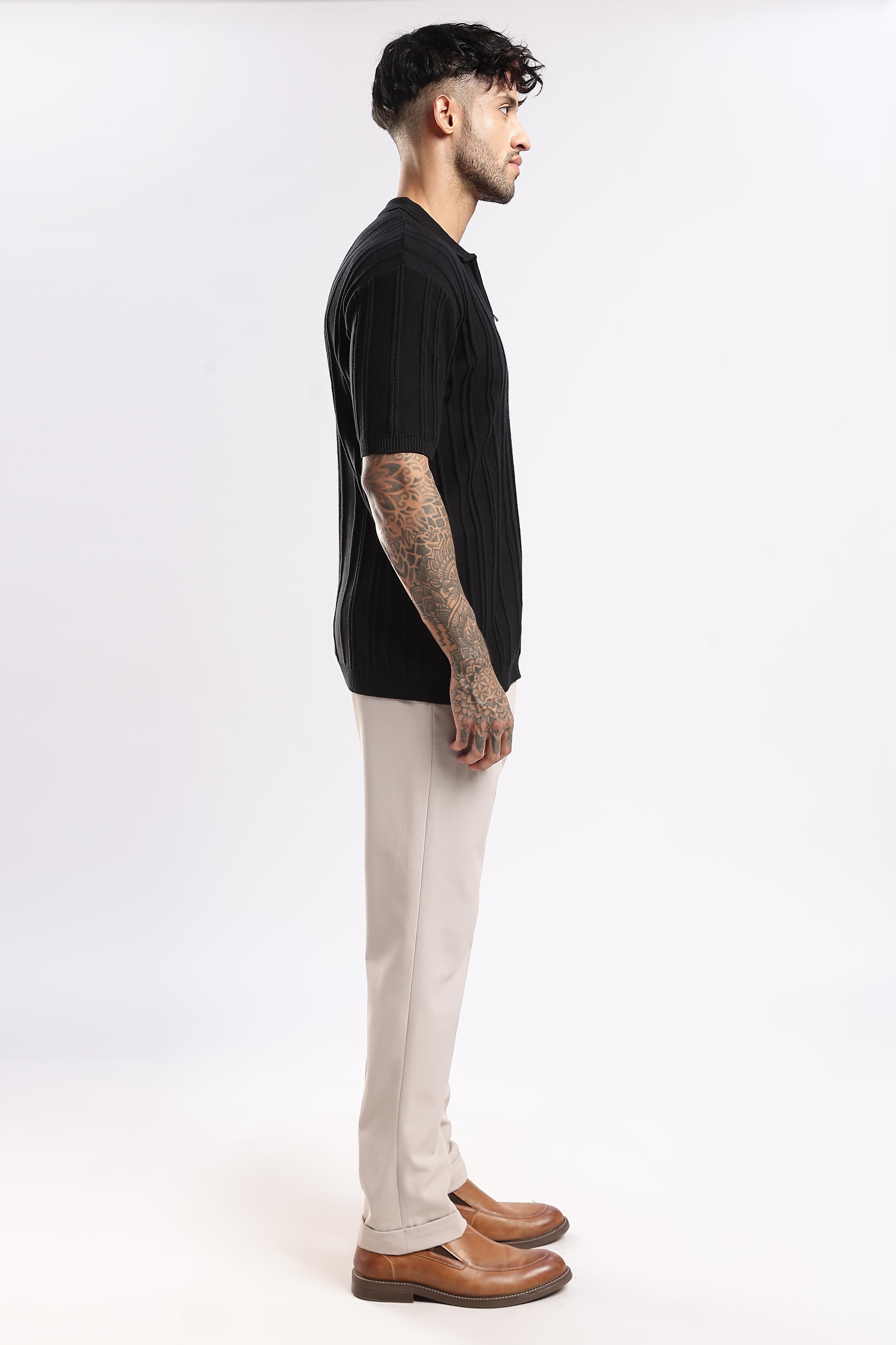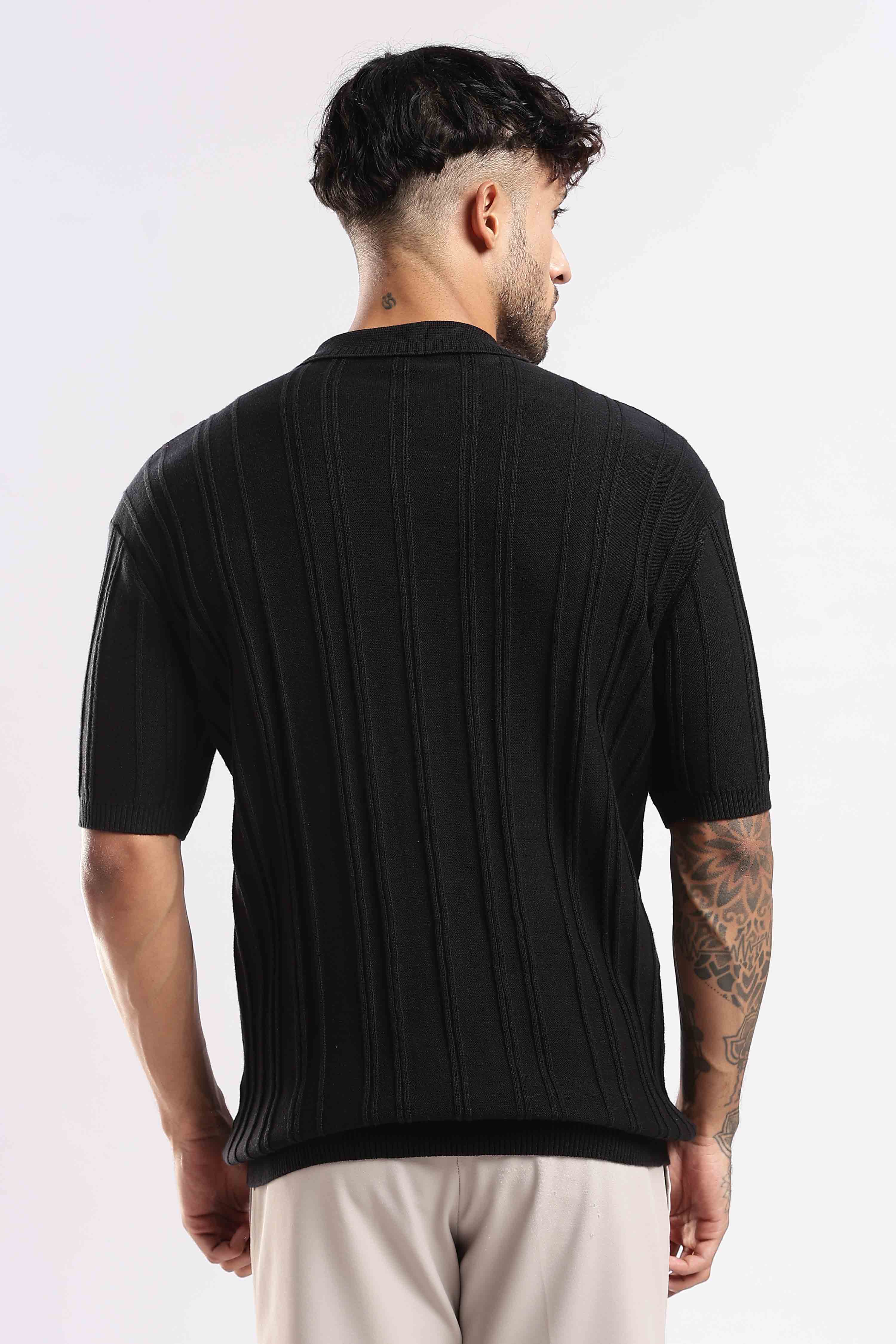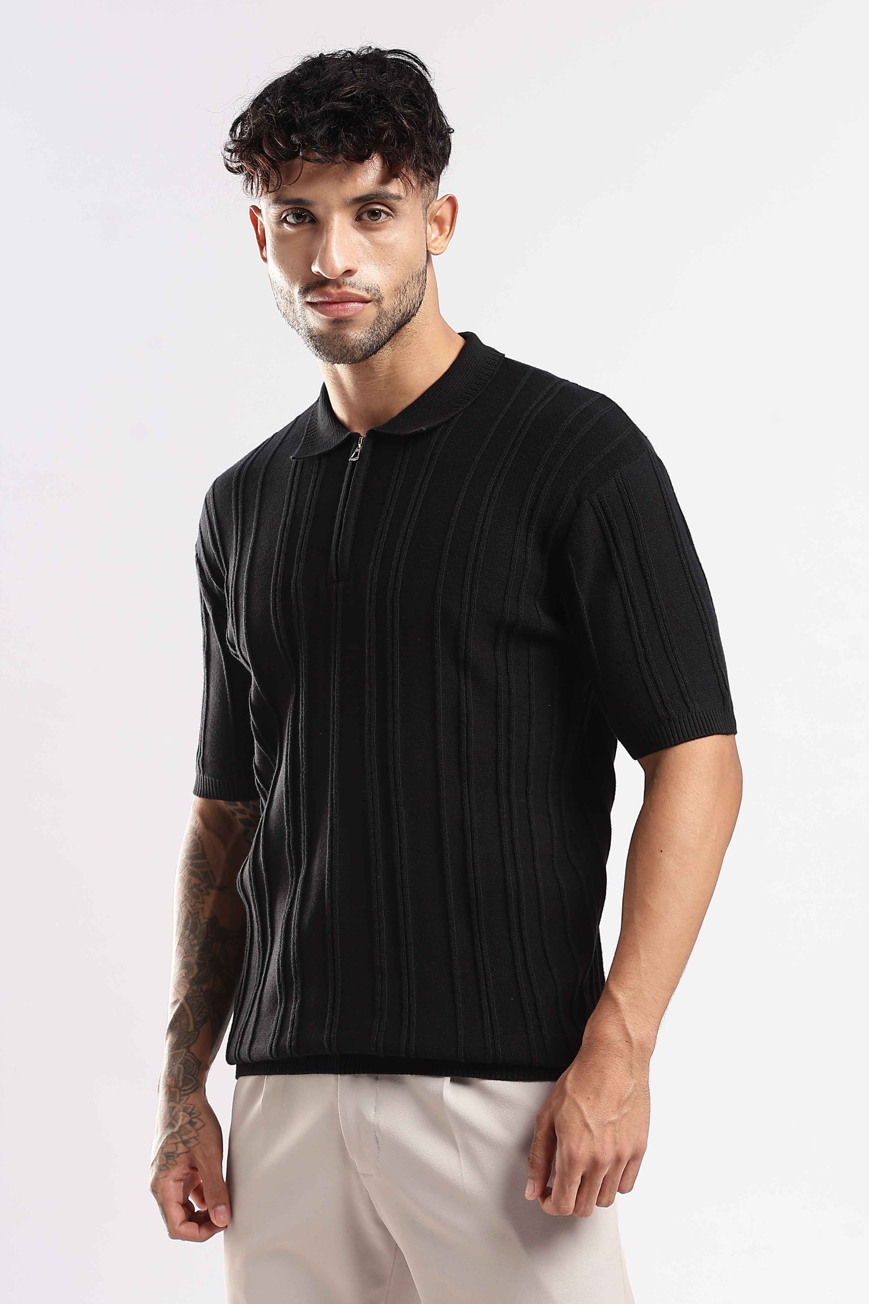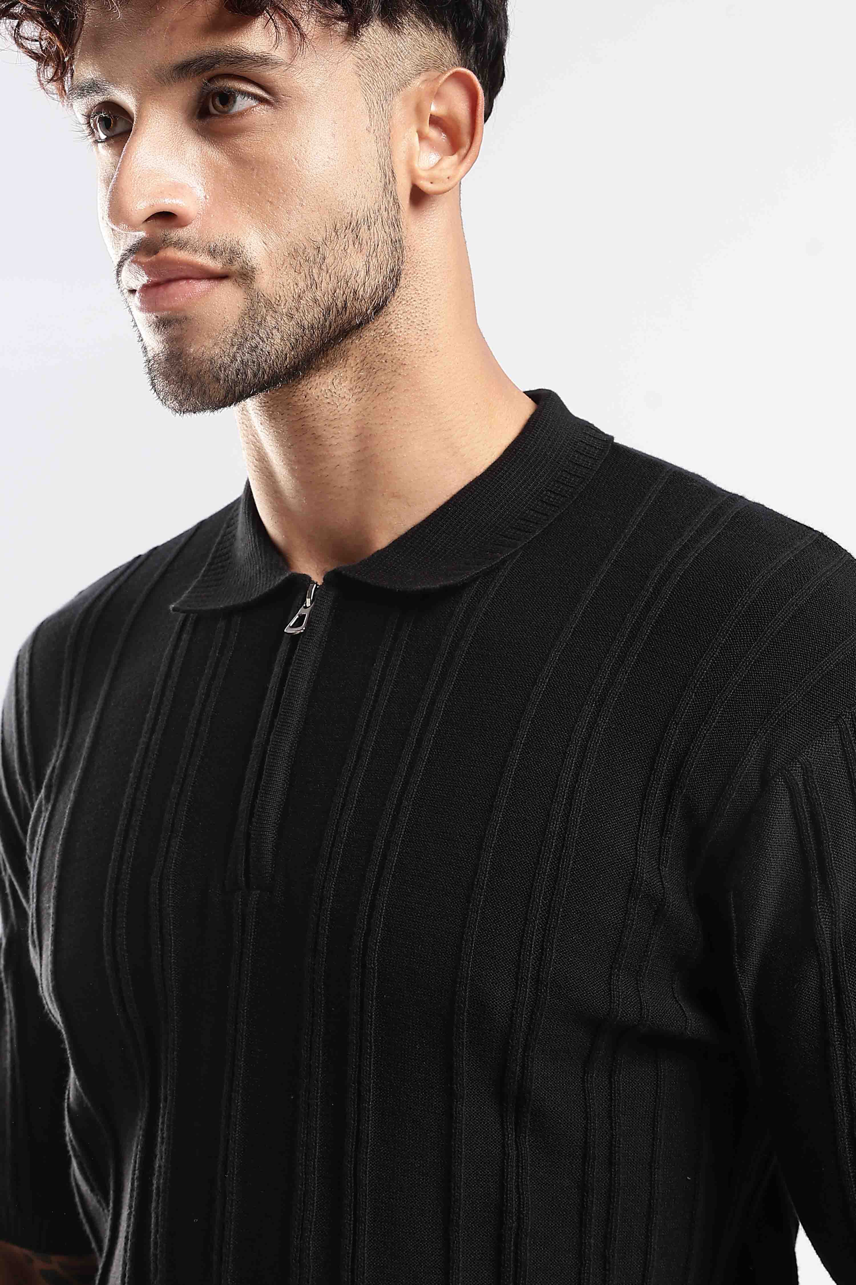 xMake a bold statement with this sleek black textured zip polo T-shirt — where modern design meets effortless sophistication. Crafted from high-quality knit fabric, this polo features vertical rib detailing that enhances the silhouette and adds refined depth. The half-zip closure gives it a contemporary twist, blending casual comfort with a polished edge.