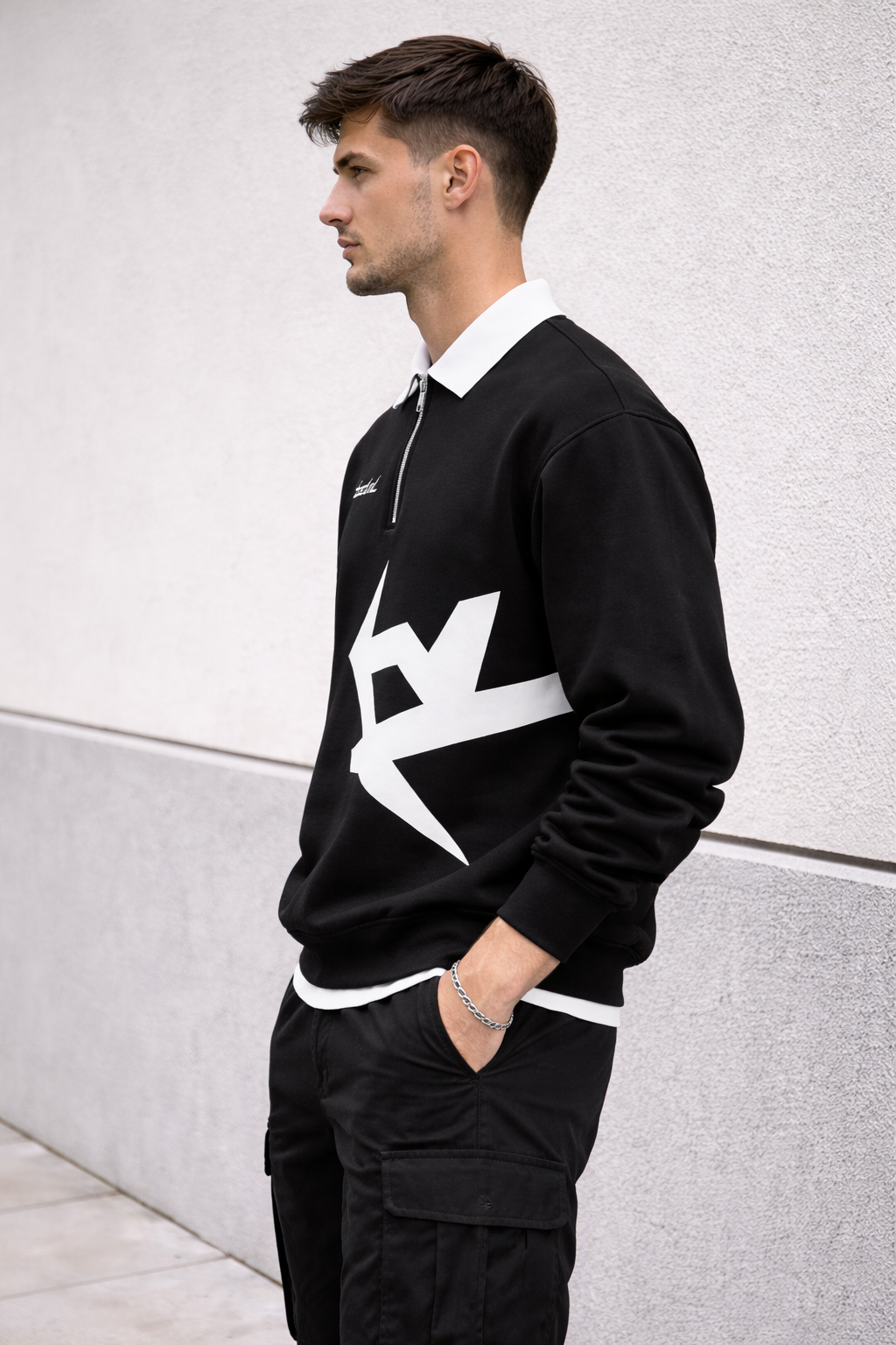 xMake a bold statement with this Black Half-Zip Sweatshirt, designed for modern streetwear lovers. Featuring a sharp lightning graphic and clean white contrast collar, this piece blends power, style, and comfort. Crafted from premium fabric for all-day wear, it’s perfect for casual fits or elevated urban looks.