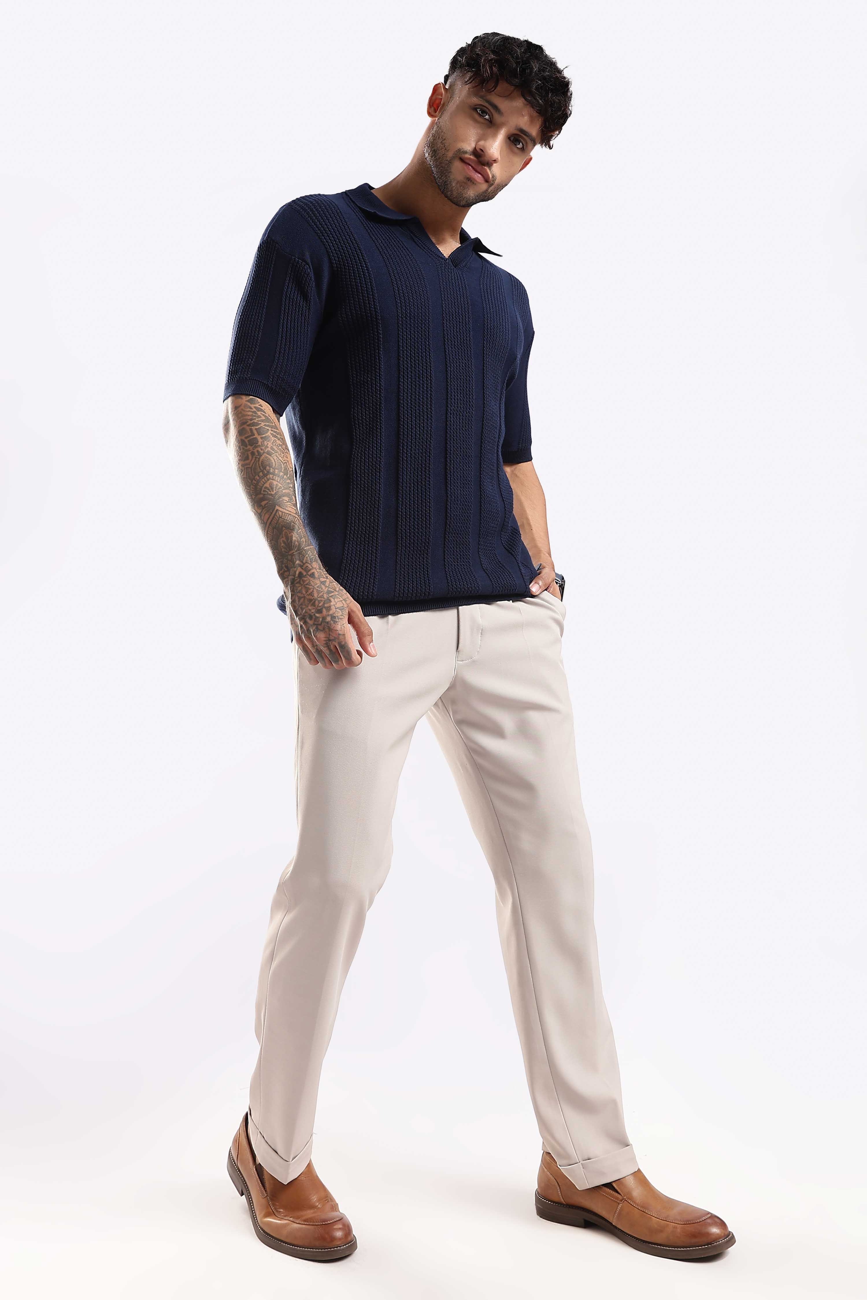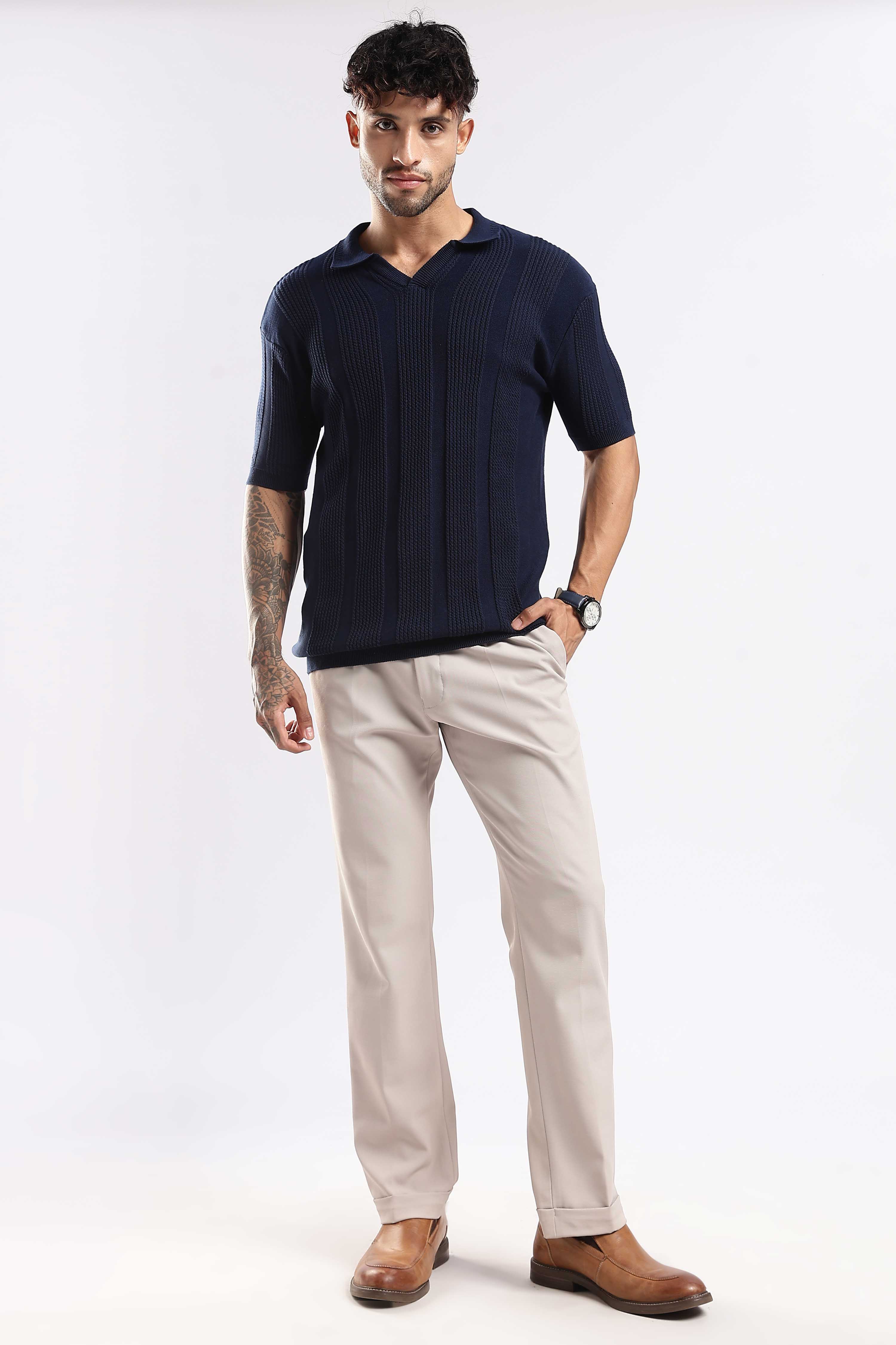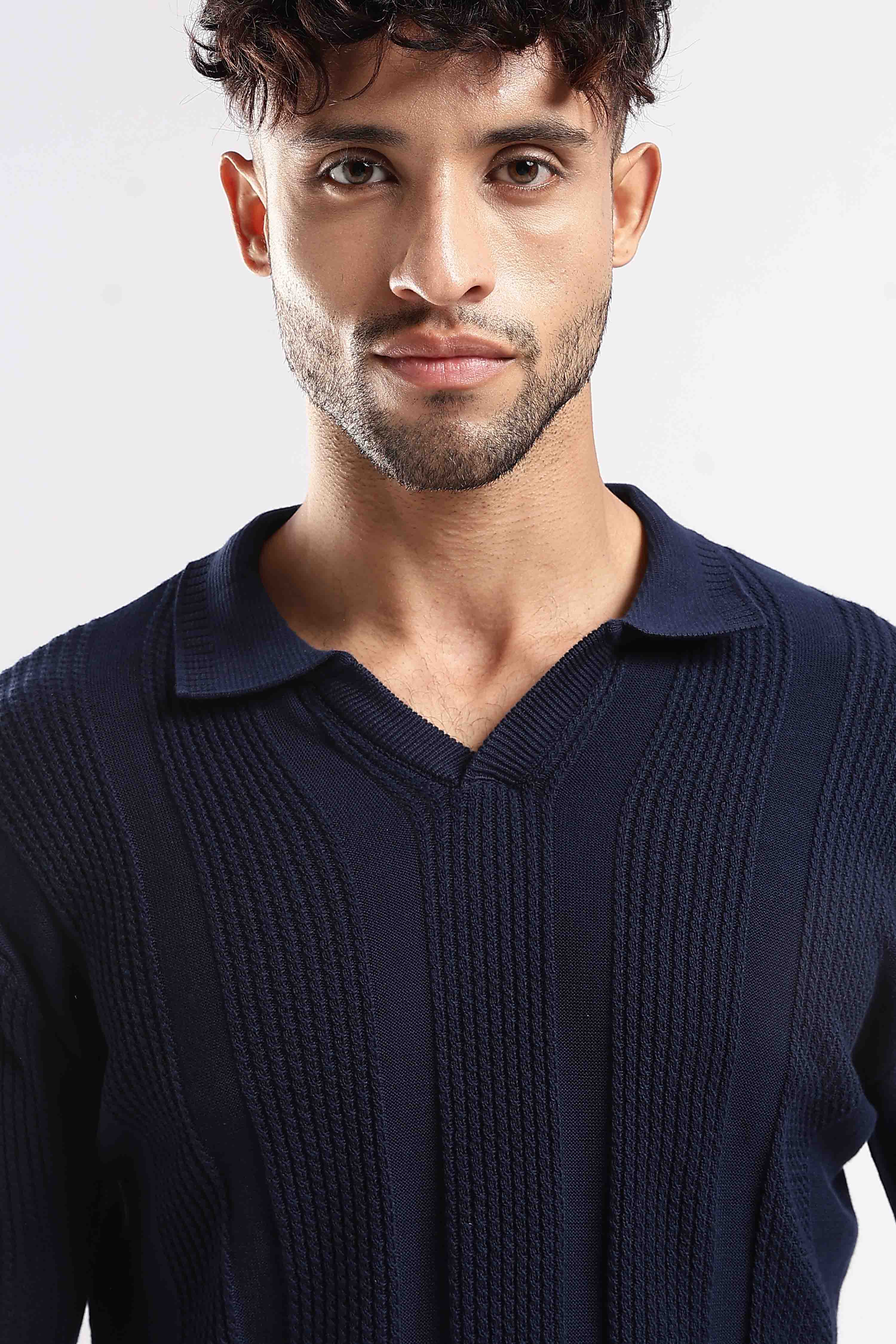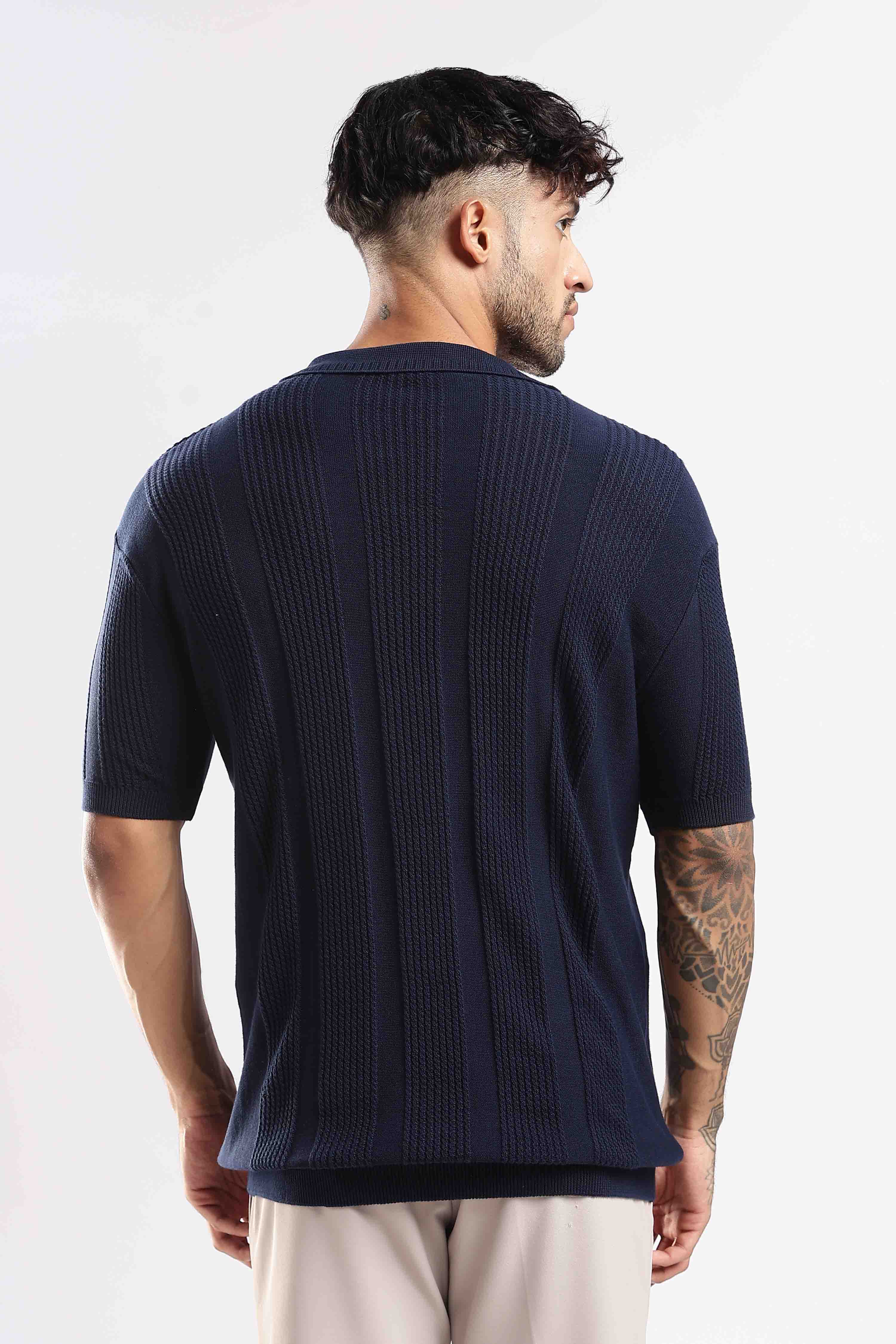 xRedefine everyday sophistication with this navy textured open-collar polo T-shirt. Crafted from premium knit fabric, it combines a relaxed silhouette with intricate vertical patterns that add structure and depth. The open-collar neckline gives it a contemporary edge, making it the perfect fusion of comfort and understated luxury.