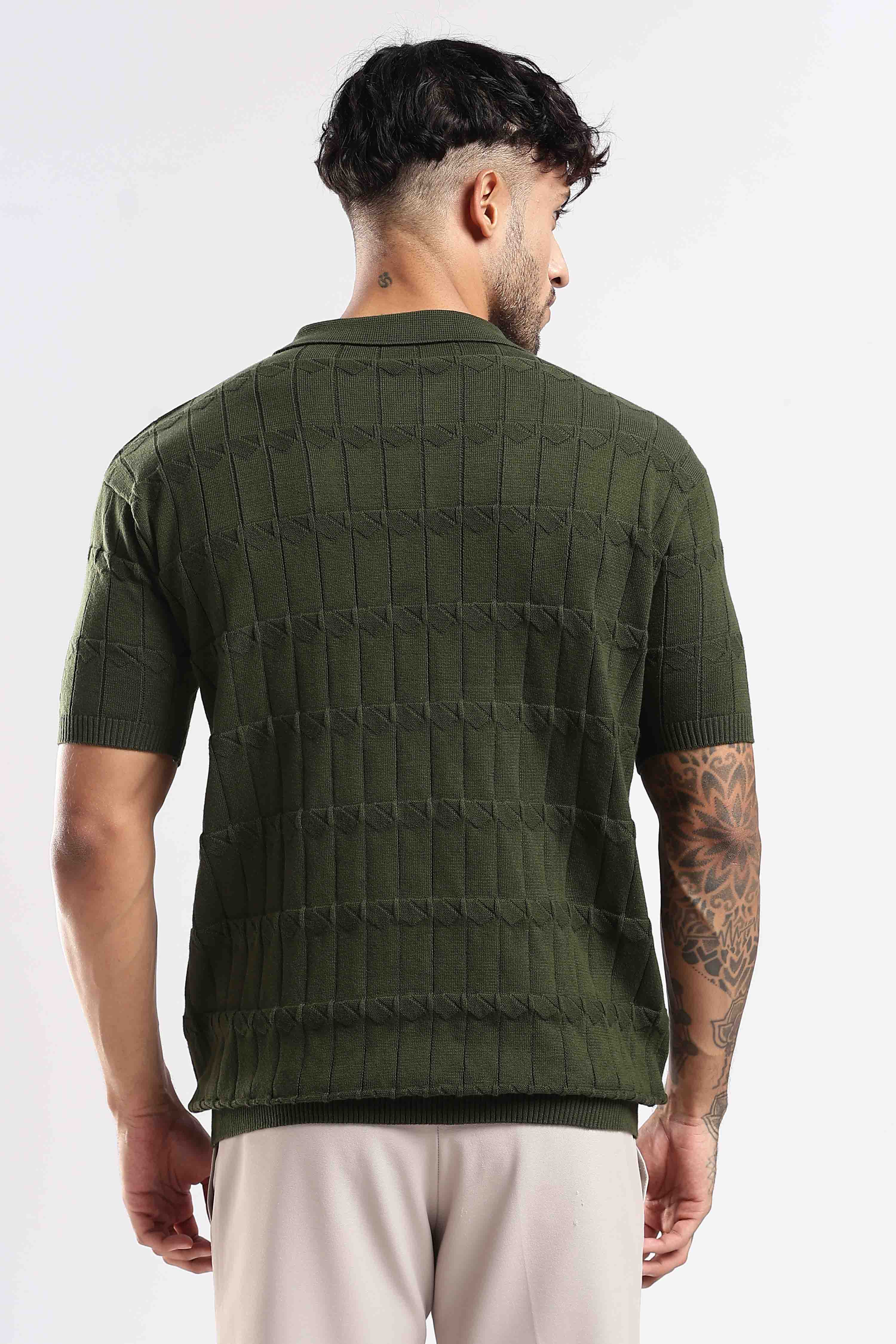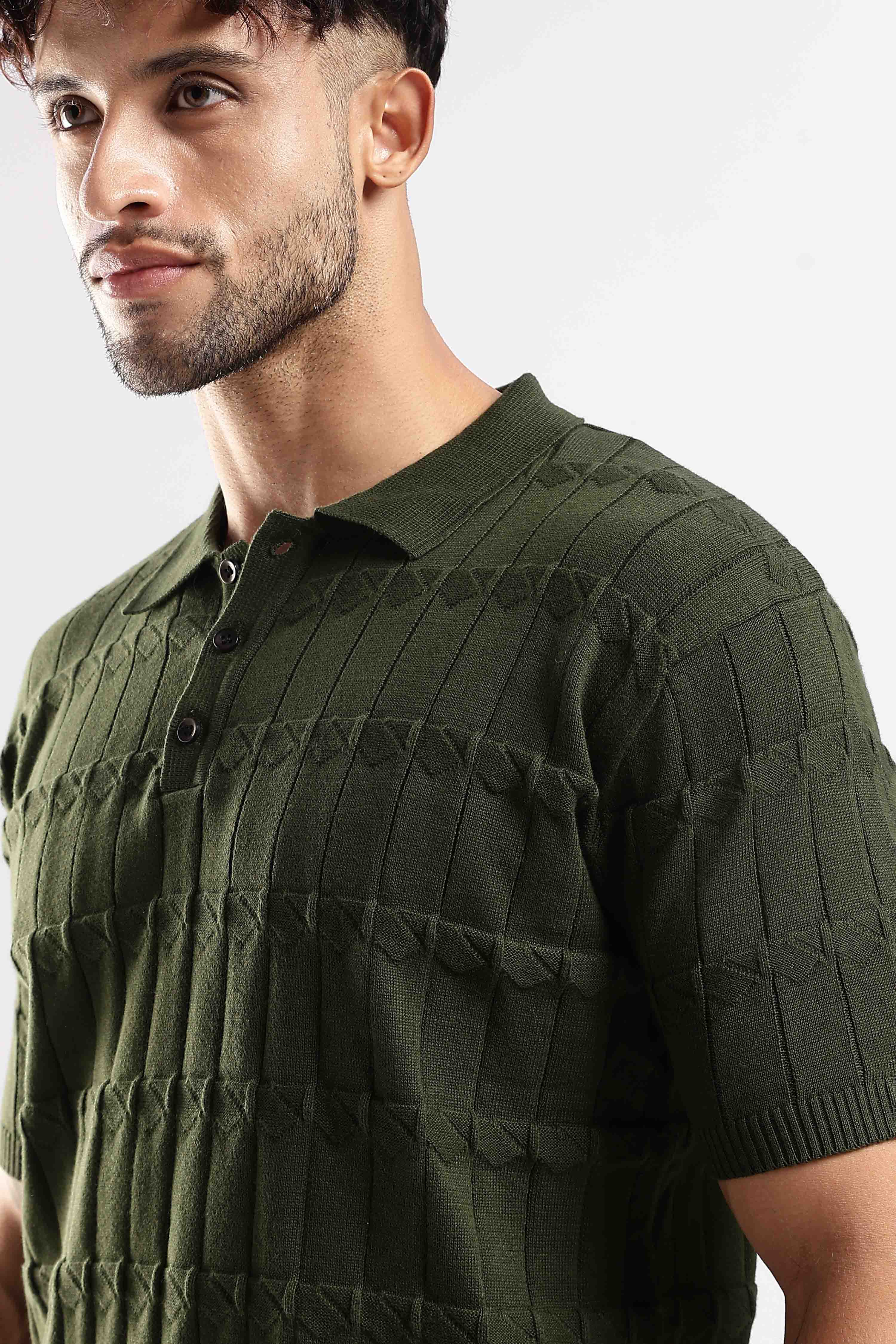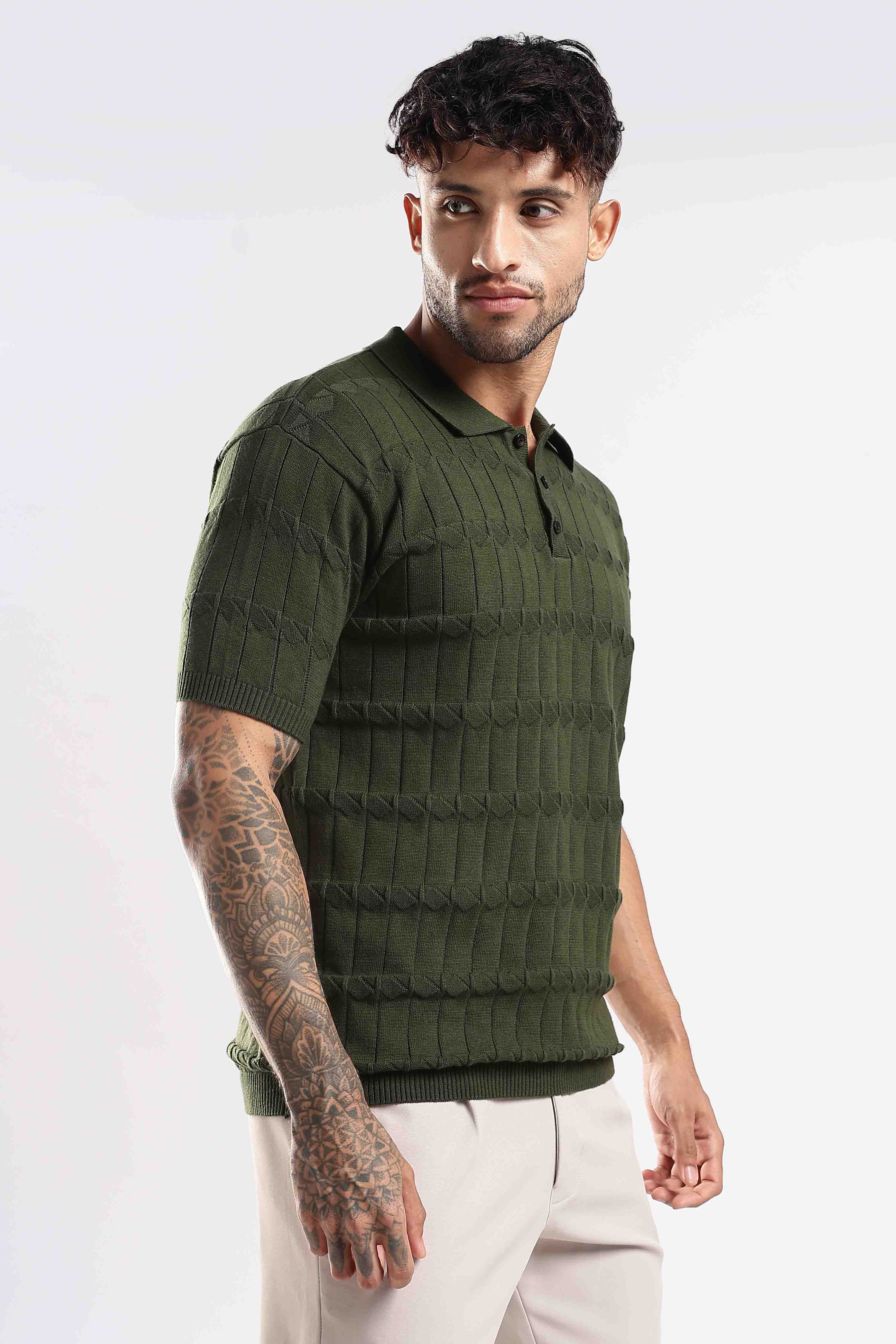 xElevate your casual style with this premium olive green knit polo T-shirt. Designed with a distinctive geometric textured pattern, it blends timeless sophistication with everyday comfort. Crafted from soft, breathable fabric, this polo offers a perfect fit and all-day ease. The ribbed collar, short sleeves, and button placket add a refined touch—ideal for both casual outings and semi-formal occasions.